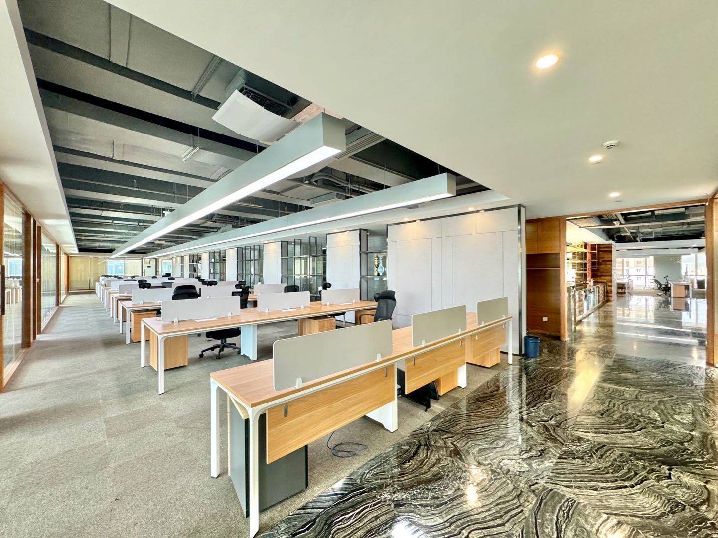豪装标准:高端石材/木饰面、品牌照明、智能窗帘、静音隔断、新风系统等,细节彰显品质